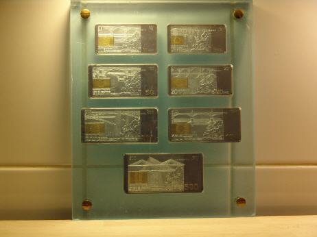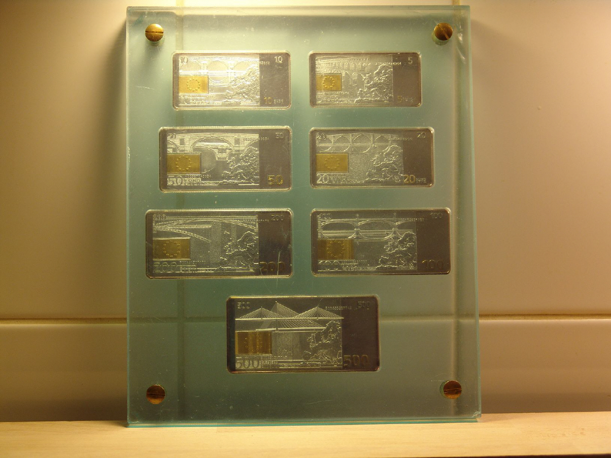 Angaben zu den Euro-Banknoten Auflage:Nur 5.000 Komplett-SätzeMaterial:Sterling-Silber (925/1000) mit Feingold (999/1000) veredeltErhaltung:"Polierte Platte" (PP)Währung:EuroGewicht:ca. 350 Gramm